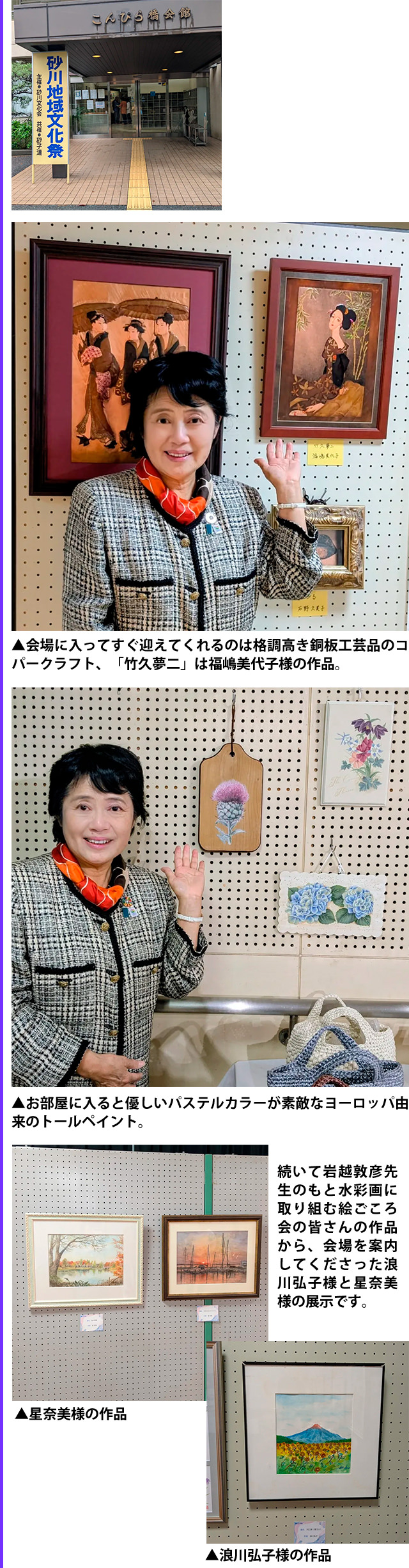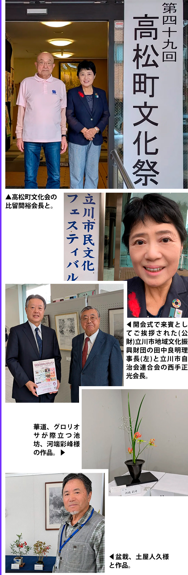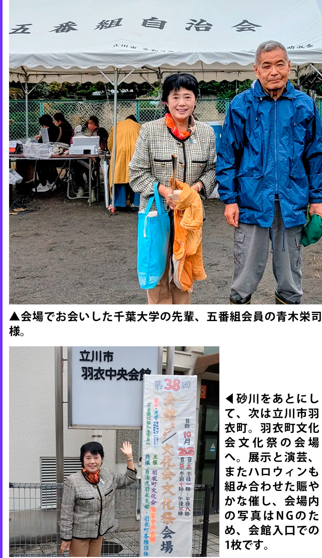 11月スタート、午前中は立川市内の文化の催しに、最初は高松会館での高松町文化祭、会場入口で高松町文化会の比留間裕会長と。続いて立川市民文化フェスティバル会場(たましんRISURUホール)へ。市内の文化団体が選りすぐりの作品を展示!!開会式では私山下ようこも祝辞を述べさせていただきました。