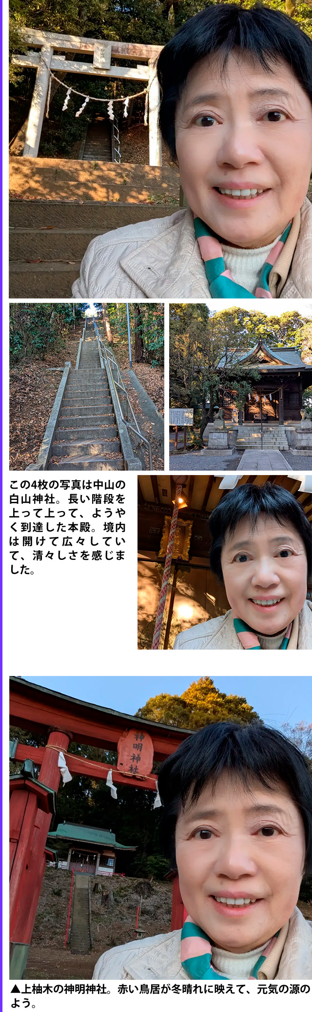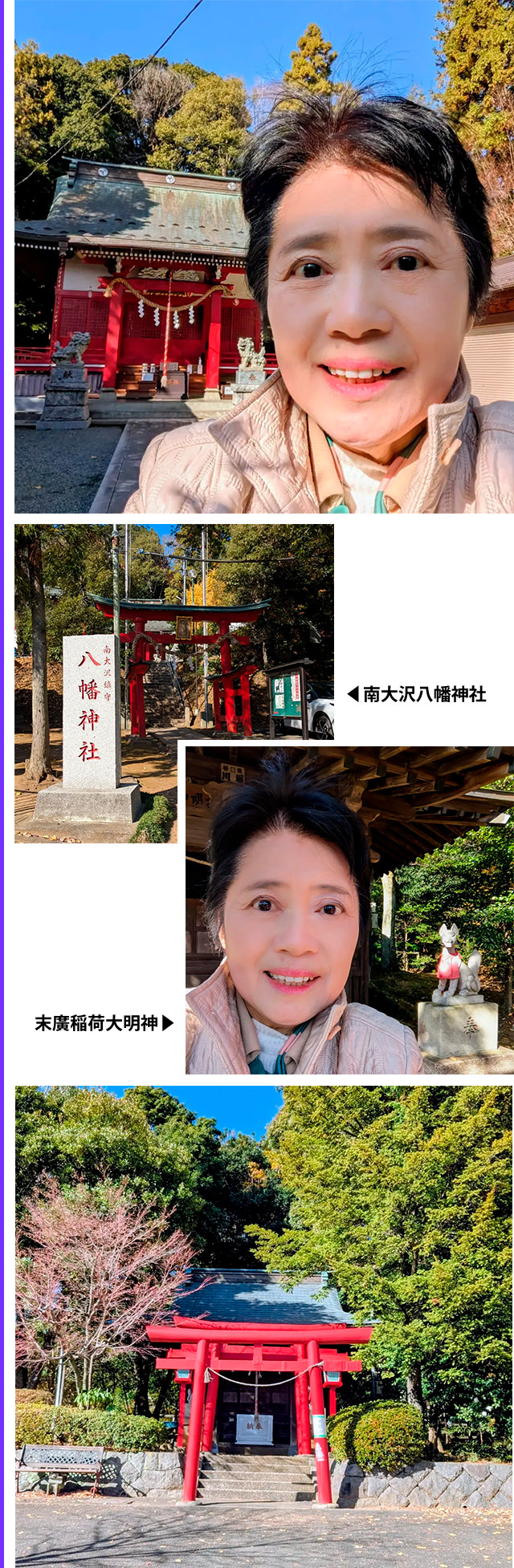 草むらまつりの会場をあとにして、私山下ようこ、南大沢駅北側の名所旧跡、南大沢八幡神社と、その隣の末廣稲荷大明神へ。どちらも清潔感のある境内で、赤い鳥居、青空、赤や黄に色づく木々、その色のコントラストが美しく、心洗われる時間でした。