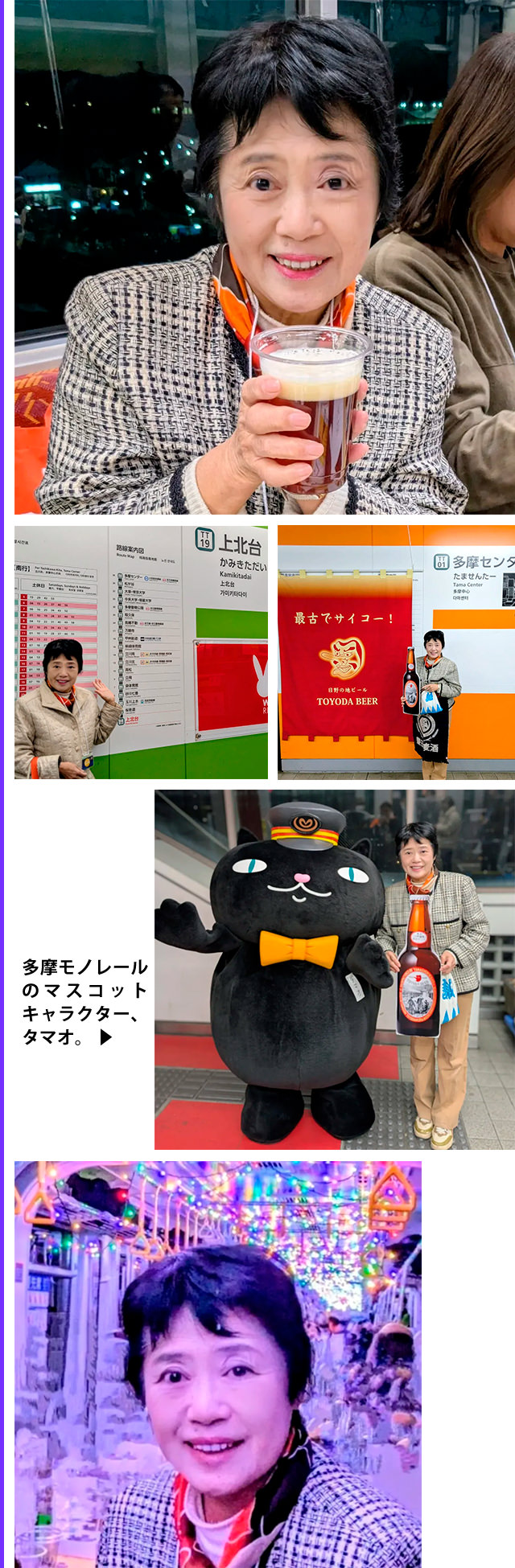 衆議院東京都第21選挙区を主な活動地域としている私山下ようこにとって多摩モノレールは大事な足。その多摩モノレールに乗って、多摩地区最古の地ビール、日野市の豊田ビールを味わう多摩モノ地ビール列車が今夜運行され、私も師走の夜を楽しみました。貸切列車は上北台駅を出発し、豊田ビールで乾杯! 玉川上水駅からは立川市に入り、甲州街道駅からは日野市に。そして中央大学明星大学駅からは八王子市に。松が谷駅を経て終点の多摩センター駅に到着。多摩センター駅では多摩モノレールのマスコットキャラクター、タマオも出迎えてくれました。帰りは立川北駅まで北上。多摩センター駅を出発すると、車内を暗くして天井のイルミネーションが点灯!拍手が鳴り響きました。そして立川北駅到着、約2時間、心に残る旅でした。