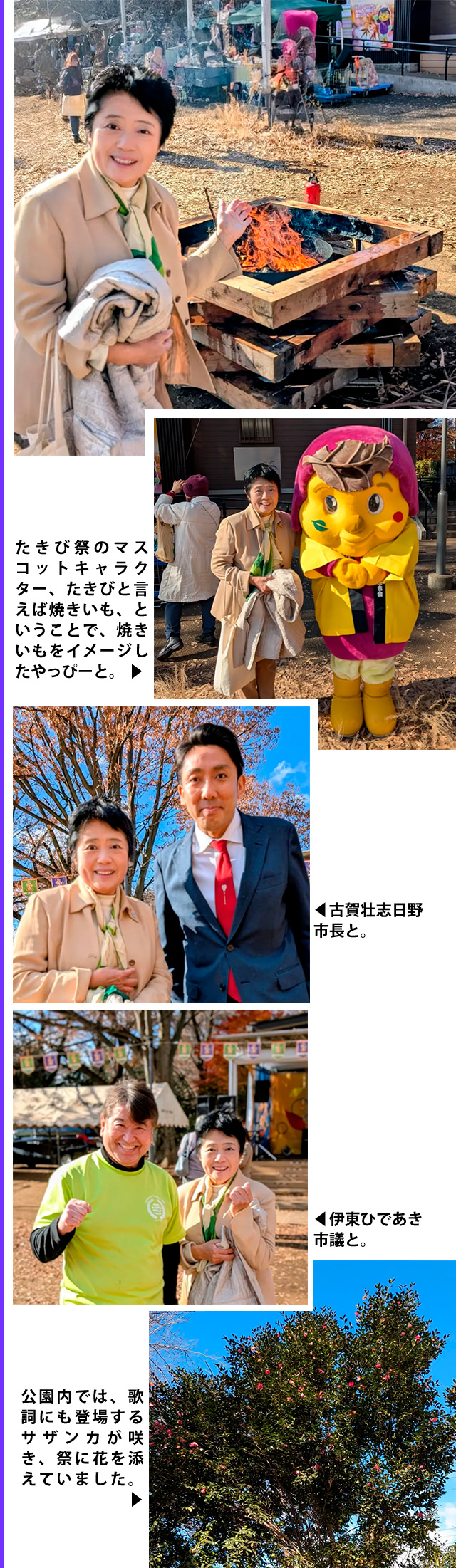 師走に入り、たきびの温もりがうれしい日々。童謡「たきび」の作詞者巽聖歌が、その後半生を日野市旭が丘で過ごしたことから、旭が丘中央公園では毎年この時期、たきび祭が開かれます。今日は青空のもと、たきびに点火!私山下ようこも会場に伺い、ステージの音楽など、楽しい時間を過ごしました。