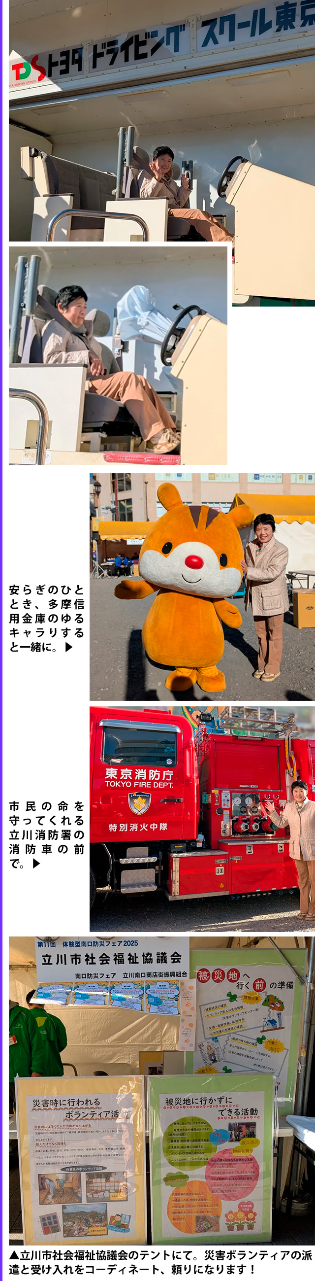 今日午後は立川市柴崎町で開かれた立川南口体験型防災フェアへ。早速、体験したのはトヨタドライビングスクール東京のコーナーのシートベルトコンビンサー、シートベルトの重要性を実感するためのシステムです。シートベルトをしっかり締めれば、衝突の際、エアーバッグが開き、身を守れる、というもの。私もシートベルトを締めて、余裕を持って、さあ出発!でも装置停止の際の衝撃と大きな音、そしてエアーバッグが飛び出てビックリ!ちなみに私#山下ようこ学生時代にトヨタドライビングスクールで運転免許を取得しました。