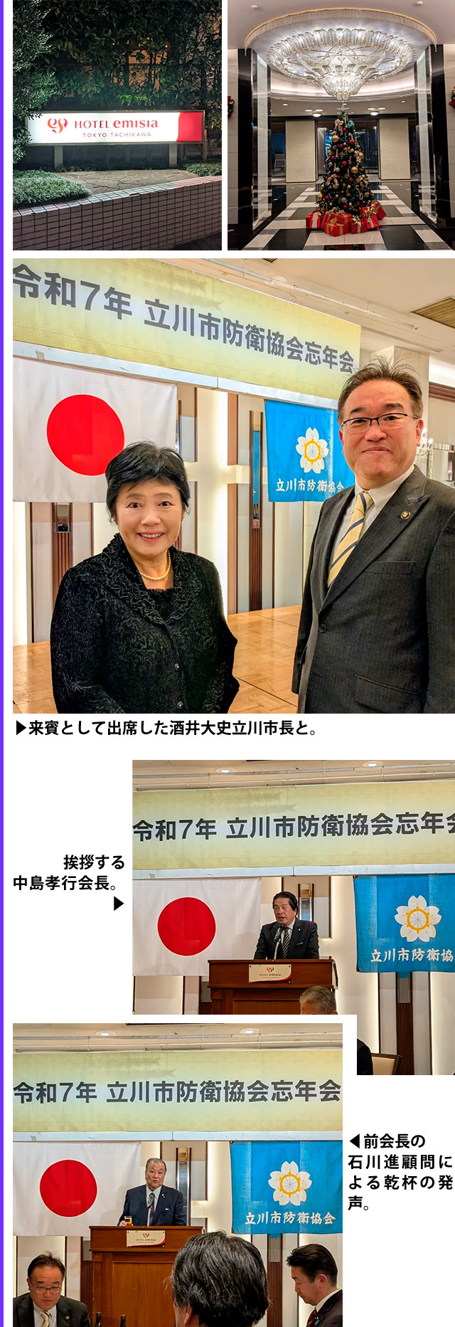 立川市防衛協会の忘年会がホテルエミシア東京立川で今夜、開かれ、私山下ようこも会員の一人として出席しました。石川前会長、お世話になりました。そして中島新会長のもと、協会のさらなる発展を願います!!